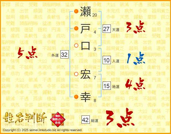 瀬(20画)戸(4画)口(3画) 宏(7画)幸(8画)