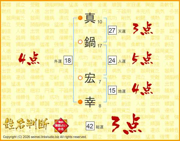 真(10画)鍋(17画) 宏(7画)幸(8画)