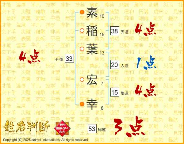 素(10画)稲(15画)葉(13画) 宏(7画)幸(8画)