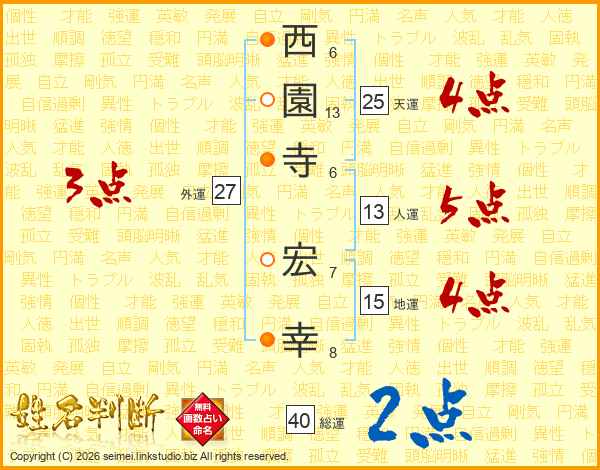 西(6画)園(13画)寺(6画) 宏(7画)幸(8画)