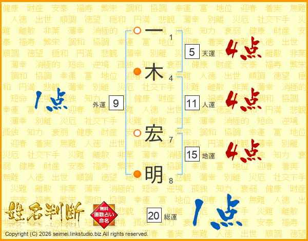 一(1画)木(4画) 宏(7画)明(8画)