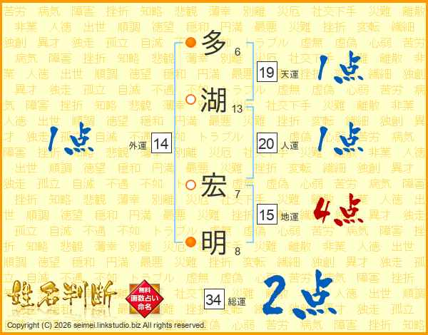 あなたの人生を表す1番重要な運勢です。生涯を通じて影響する総合運となり、主に50歳以降の晩年期に影響を及ぼします。苗字と名前の合計画数。