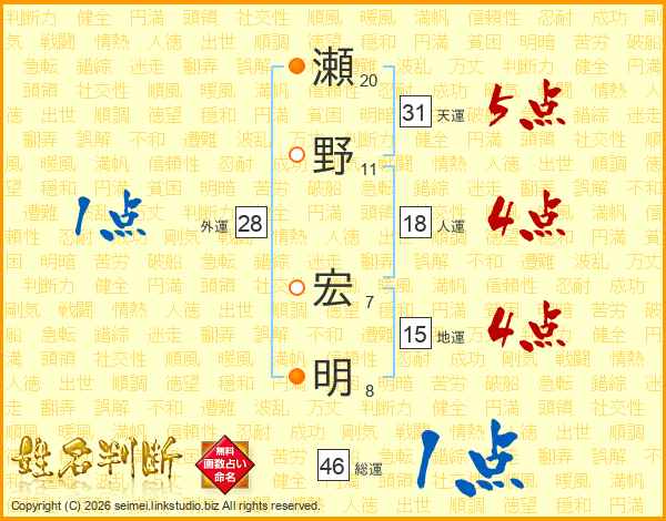 瀬野宏明さんの総運は46画の1点!