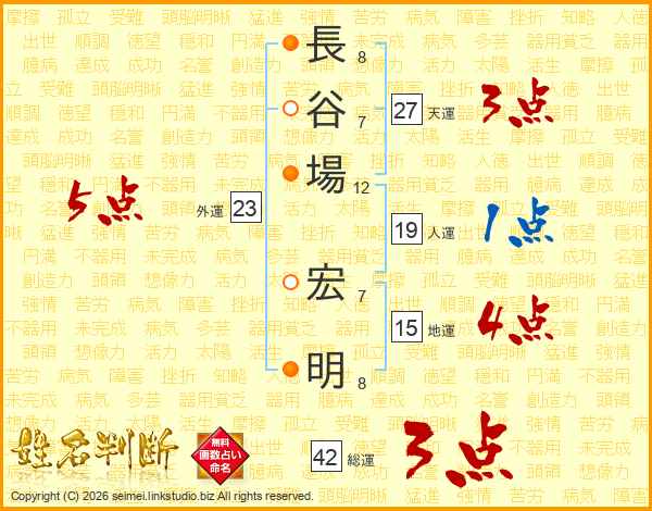 長(8画)谷(7画)場(12画) 宏(7画)明(8画)