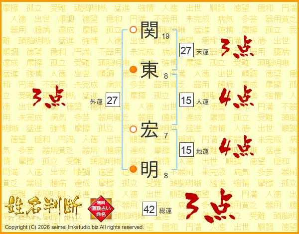 関(19画)東(8画) 宏(7画)明(8画)