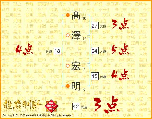 髙(10画)澤(17画) 宏(7画)明(8画)
