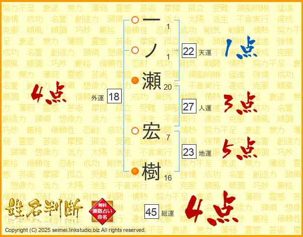 一(1画)ノ(1画)瀬(20画) 宏(7画)樹(16画)