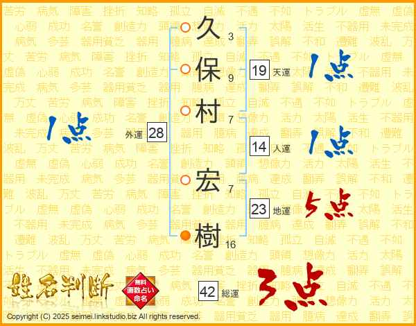 久(3画)保(9画)村(7画) 宏(7画)樹(16画)