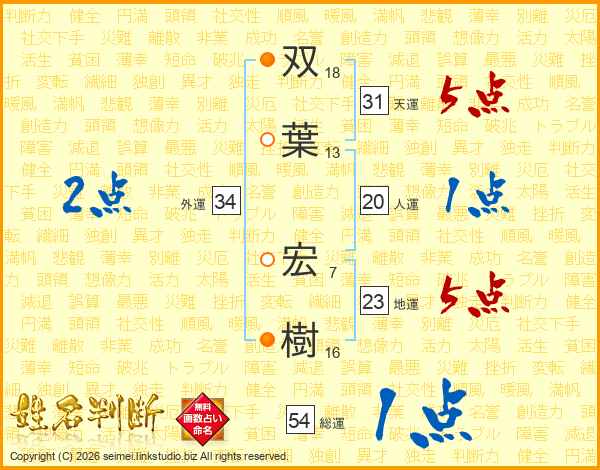 双(18画)葉(13画) 宏(7画)樹(16画)