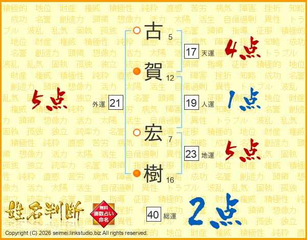 古(5画)賀(12画) 宏(7画)樹(16画)