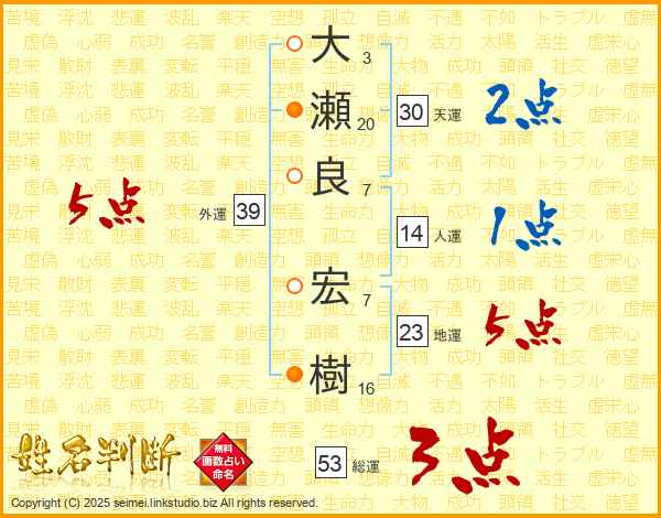 大(3画)瀬(20画)良(7画) 宏(7画)樹(16画)
