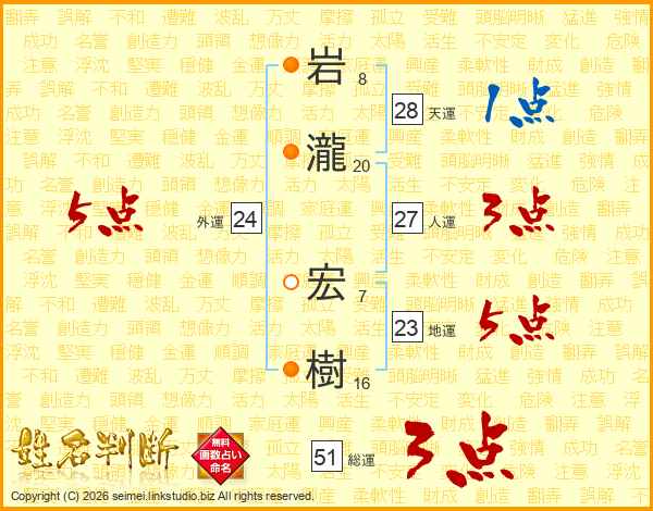 岩(8画)瀧(20画) 宏(7画)樹(16画)