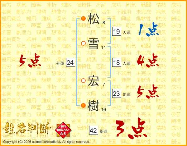 松(8画)雪(11画) 宏(7画)樹(16画)