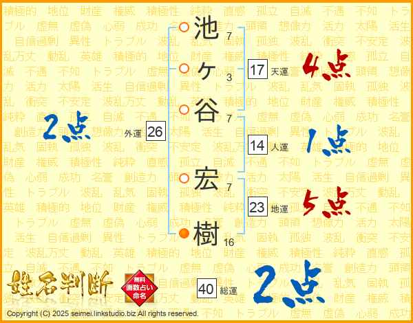 池(7画)ヶ(3画)谷(7画) 宏(7画)樹(16画)