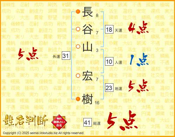 長(8画)谷(7画)山(3画) 宏(7画)樹(16画)