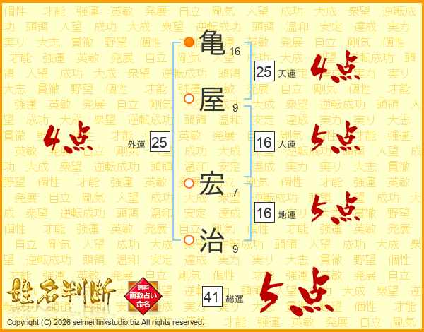 亀(16画)屋(9画) 宏(7画)治(9画)