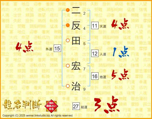 生活面を象徴する運勢です。外部から受ける影響力を表し、結婚運、家庭運や職場、環境への順応性を表します。総運から人運を引いた画数。姓や名が1文字の場合を除く。