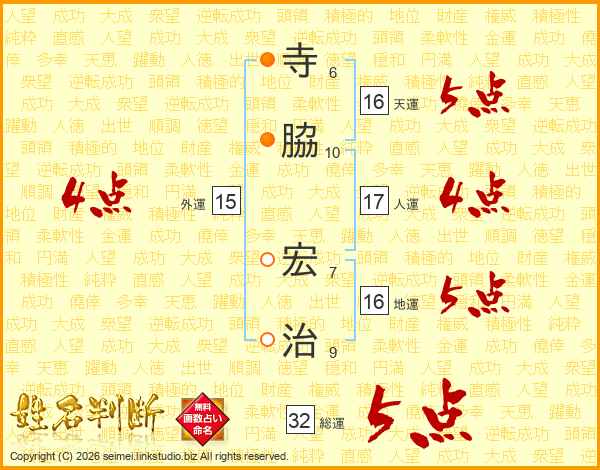 寺(6画)脇(10画) 宏(7画)治(9画)