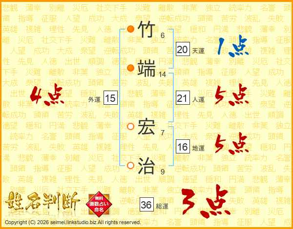生活面を象徴する運勢です。外部から受ける影響力を表し、結婚運、家庭運や職場、環境への順応性を表します。総運から人運を引いた画数。姓や名が1文字の場合を除く。