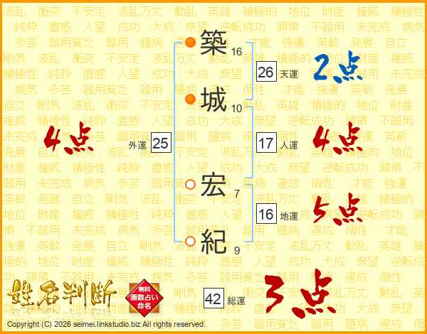 あなたの人生を表す1番重要な運勢です。生涯を通じて影響する総合運となり、主に50歳以降の晩年期に影響を及ぼします。苗字と名前の合計画数。