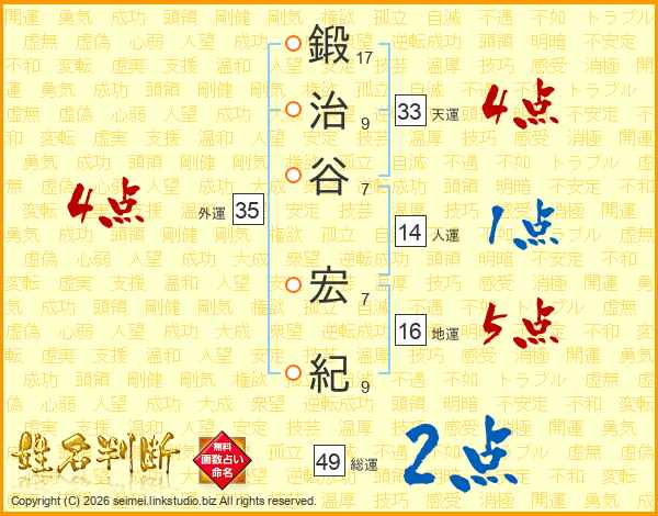 鍛治谷宏紀さんの天運は33画の4点!