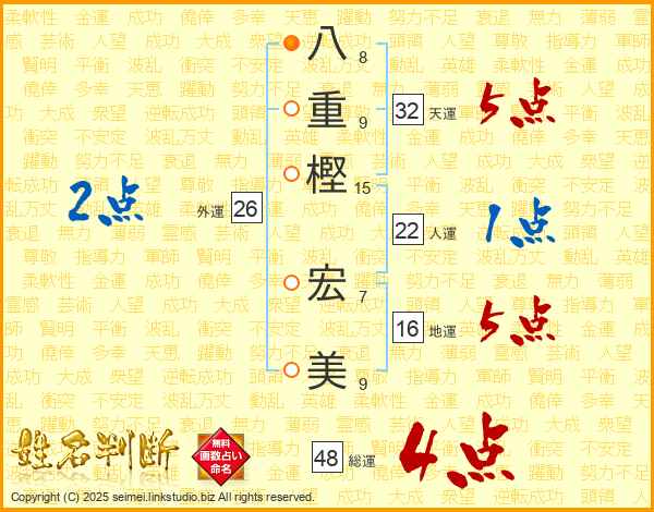 八(8画)重(9画)樫(15画) 宏(7画)美(9画)
