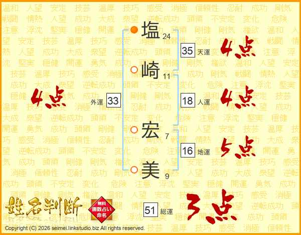 塩(24画)崎(11画) 宏(7画)美(9画)