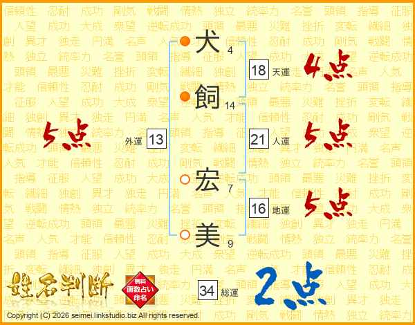 犬(4画)飼(14画) 宏(7画)美(9画)