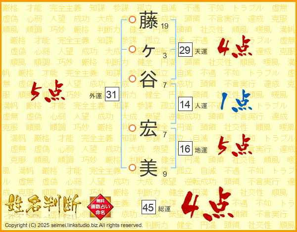 藤(19画)ヶ(3画)谷(7画) 宏(7画)美(9画)