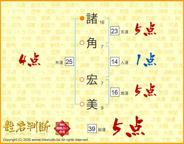 諸(16画)角(7画) 宏(7画)美(9画)