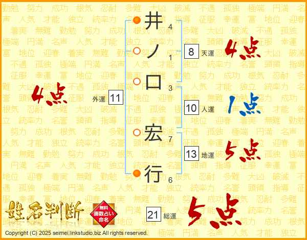 井(4画)ノ(1画)口(3画) 宏(7画)行(6画)