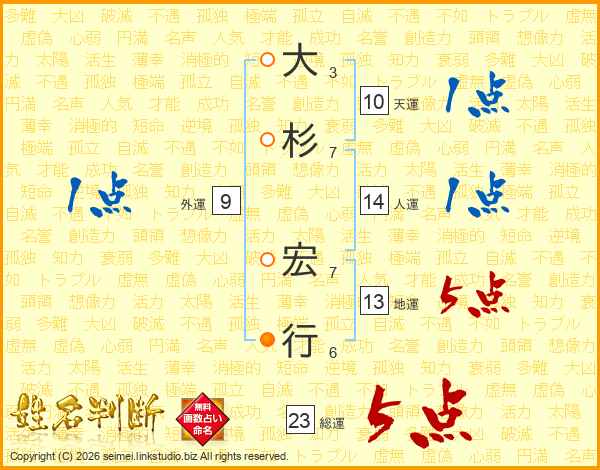 あなたの人生を表す1番重要な運勢です。生涯を通じて影響する総合運となり、主に50歳以降の晩年期に影響を及ぼします。苗字と名前の合計画数。