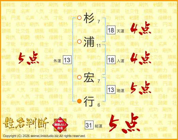 杉(7画)浦(11画) 宏(7画)行(6画)