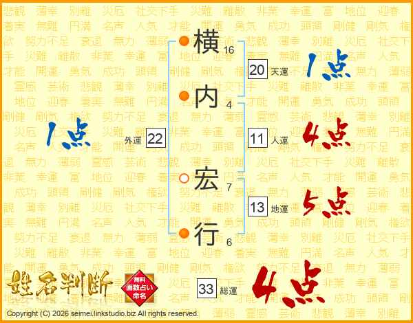 生活面を象徴する運勢です。外部から受ける影響力を表し、結婚運、家庭運や職場、環境への順応性を表します。総運から人運を引いた画数。姓や名が1文字の場合を除く。