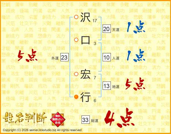 沢(17画)口(3画) 宏(7画)行(6画)