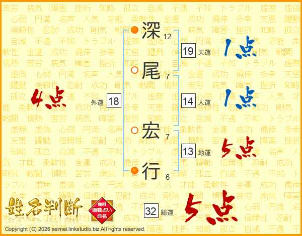 あなたの人生を表す1番重要な運勢です。生涯を通じて影響する総合運となり、主に50歳以降の晩年期に影響を及ぼします。苗字と名前の合計画数。