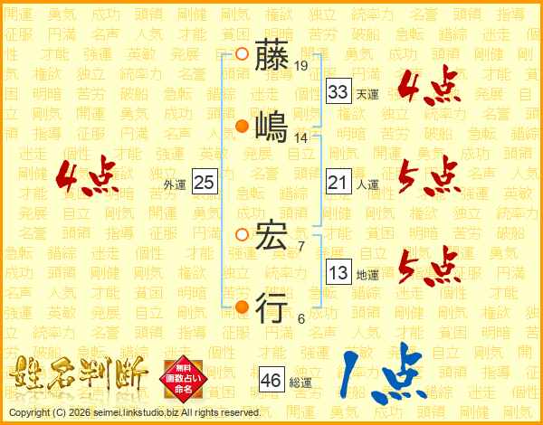 藤(19画)嶋(14画) 宏(7画)行(6画)