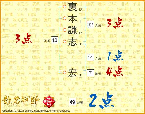 裏(13画)本(5画)謙(17画)志(7画) 宏(7画)