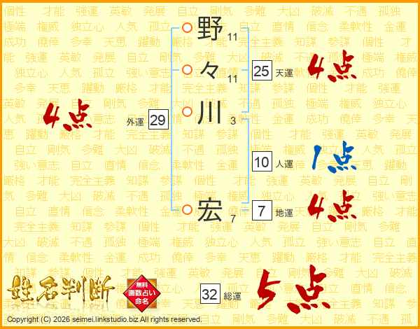 生活面を象徴する運勢です。外部から受ける影響力を表し、結婚運、家庭運や職場、環境への順応性を表します。総運から人運を引いた画数。姓や名が1文字の場合を除く。