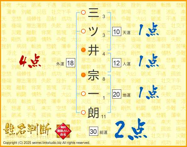三(3画)ツ(3画)井(4画) 宗(8画)一(1画)朗(11画)