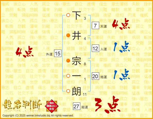 下(3画)井(4画) 宗(8画)一(1画)朗(11画)
