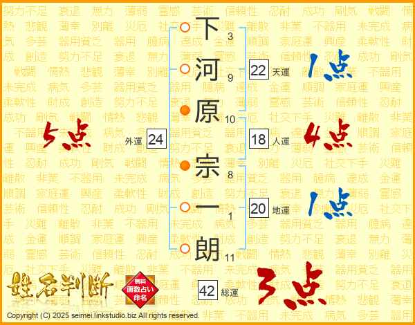 下(3画)河(9画)原(10画) 宗(8画)一(1画)朗(11画)