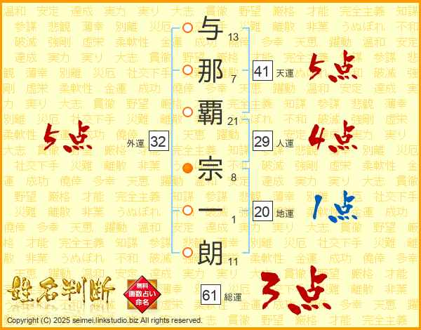 与(13画)那(7画)覇(21画) 宗(8画)一(1画)朗(11画)