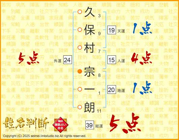 久(3画)保(9画)村(7画) 宗(8画)一(1画)朗(11画)