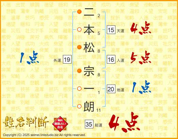 二(2画)本(5画)松(8画) 宗(8画)一(1画)朗(11画)