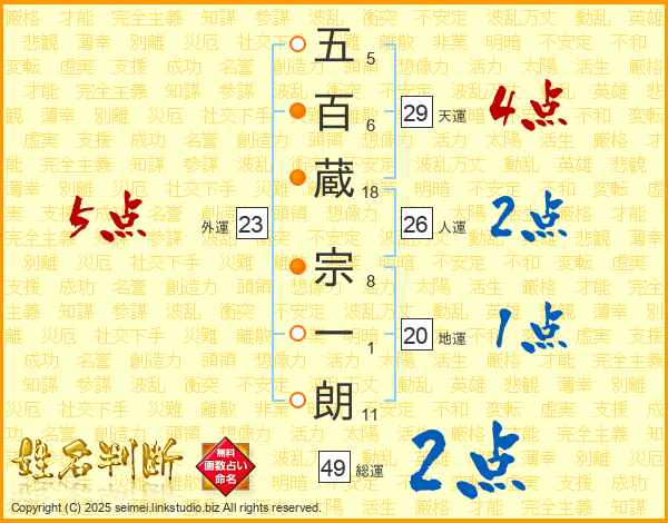 五(5画)百(6画)蔵(18画) 宗(8画)一(1画)朗(11画)
