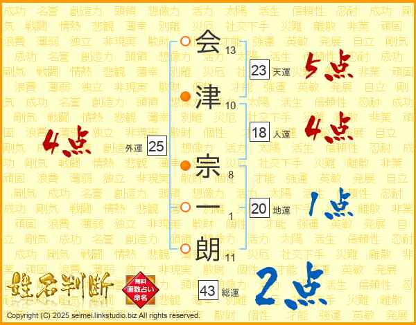 会(13画)津(10画) 宗(8画)一(1画)朗(11画)