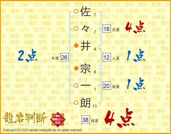 佐(7画)々(7画)井(4画) 宗(8画)一(1画)朗(11画)