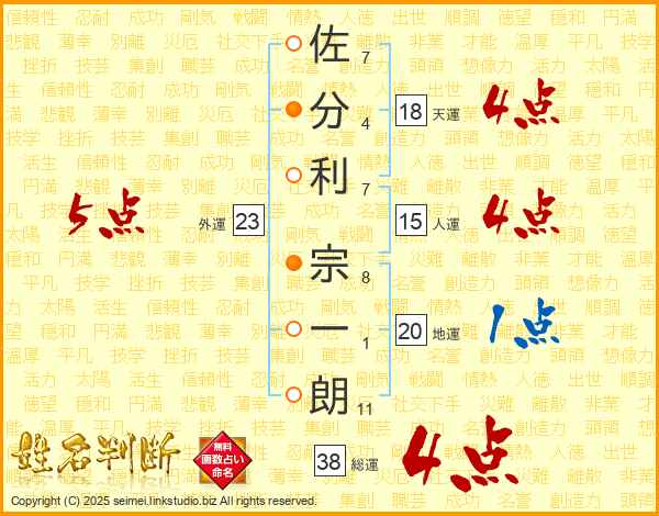 佐(7画)分(4画)利(7画) 宗(8画)一(1画)朗(11画)