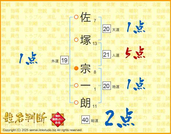 佐(7画)塚(13画) 宗(8画)一(1画)朗(11画)